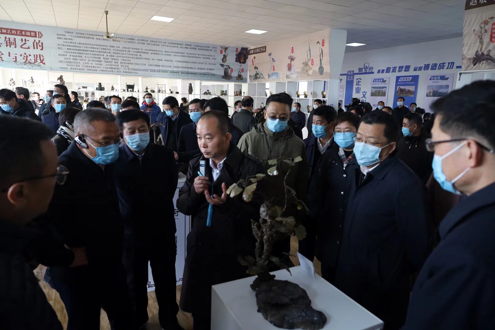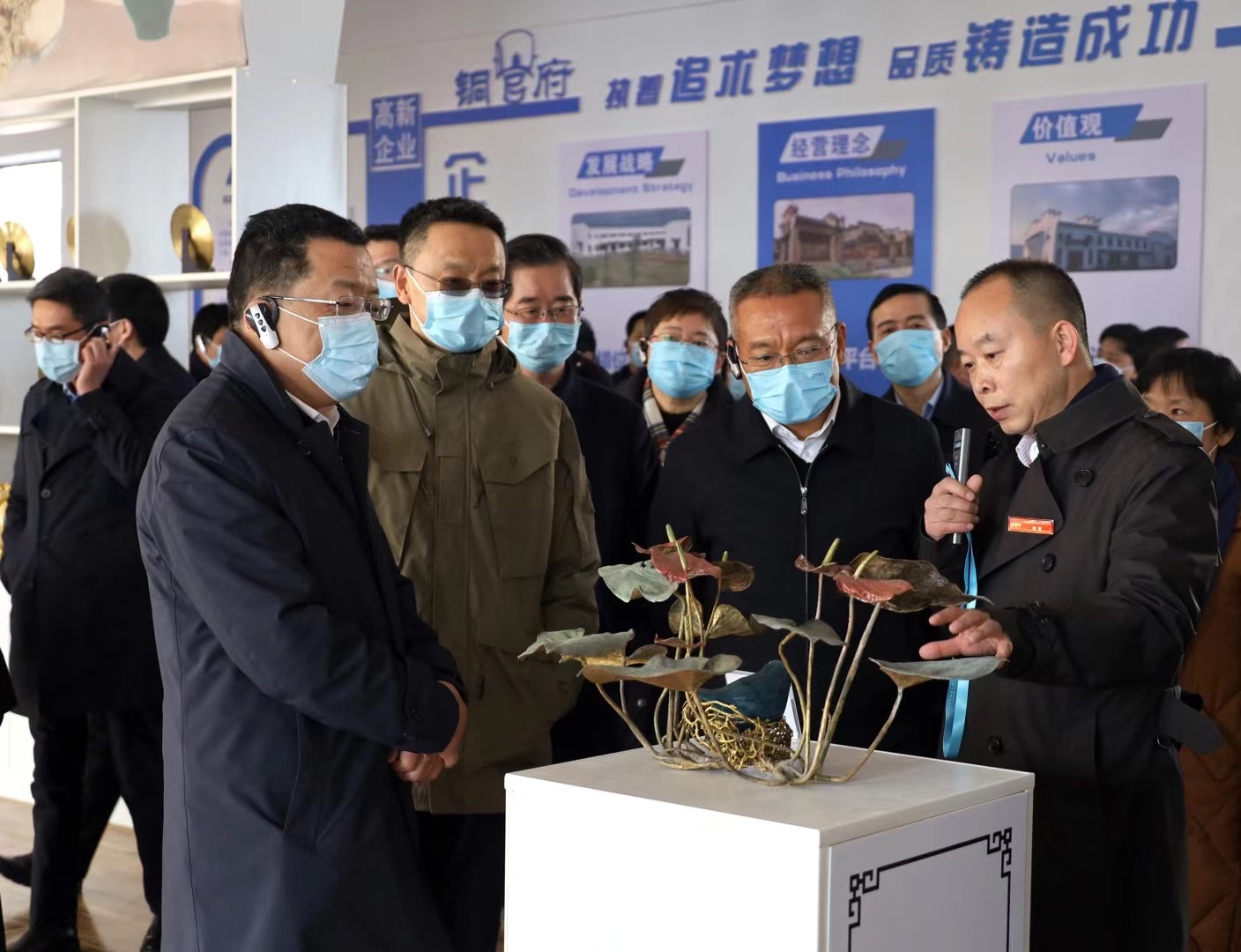 1月12日下午,中共銅陵市委十屆十四次全體(擴(kuò)大)會(huì)議期間,市委書記丁純,市委副書記、市長胡啟生及各市直部門、開發(fā)園區(qū)和縣區(qū)主要負(fù)責(zé)人等近百人,現(xiàn)場(chǎng)觀摩銅官府銅藝產(chǎn)業(yè)園。全體委員還集中參觀了全國景泰藍(lán)職業(yè)技能競(jìng)賽參加決賽選手作品以及趙敏的寫真銅藝作品等。