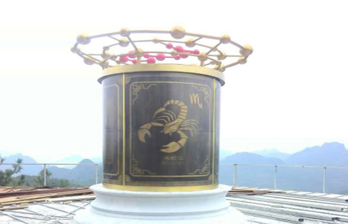 十二星座整體采用直筒造型,簡(jiǎn)潔大方,大氣穩(wěn)定。采用精銅雕刻工藝精制而成的十二星座銅柱周圍的浮雕。